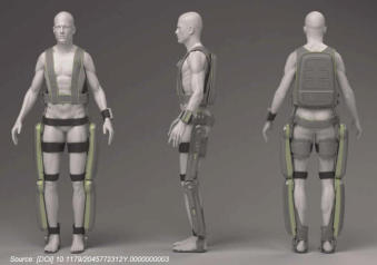 An exoskeleton is a wearable brace support suit featuring